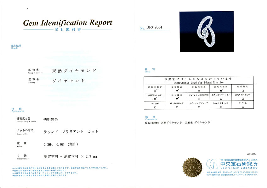 中央宝石研究所発行のダイヤモンド鑑別書付 |