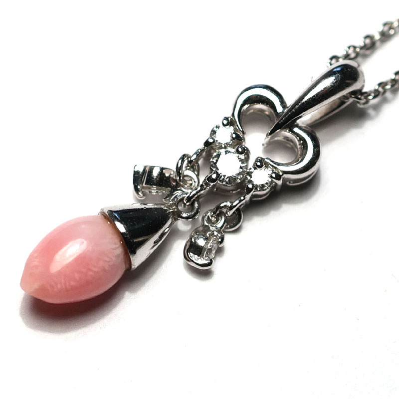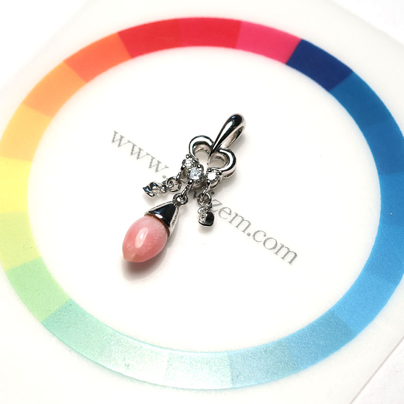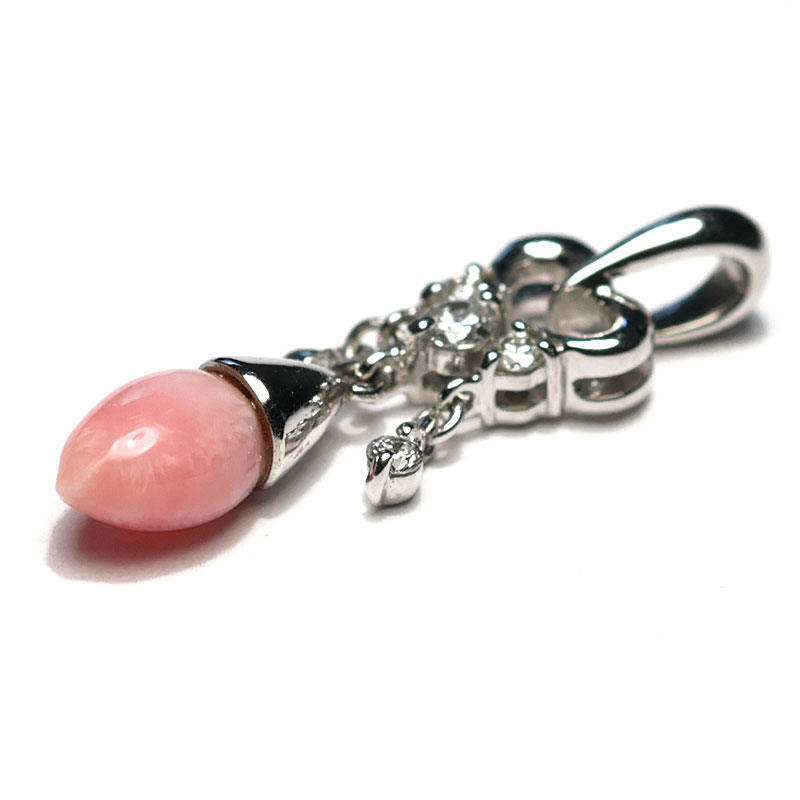 【コメント】優しいピンク色、揺らめく火炎模様が見られます。巻貝の天然真珠にみられる特徴のツイスト、ひねりがあります。身に着けた際は見えませんが、真下からみると白っぽい部分ございます。