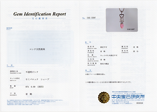 付属します。中央宝石研究所発行の宝石鑑別書 |