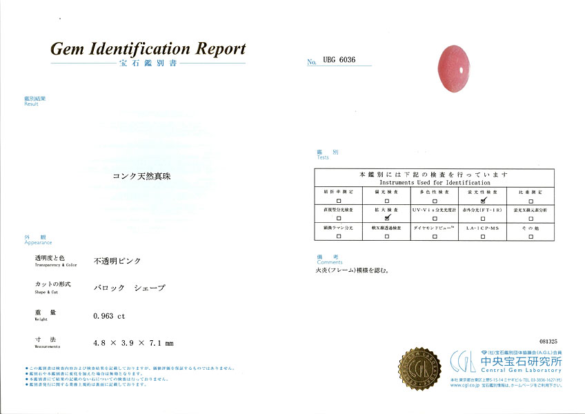 商品名 : コンク天然真珠ルース0.963ct 7.1mmx4.8mmx3.9mm 宝石鑑別書附属(中央宝石研究所)